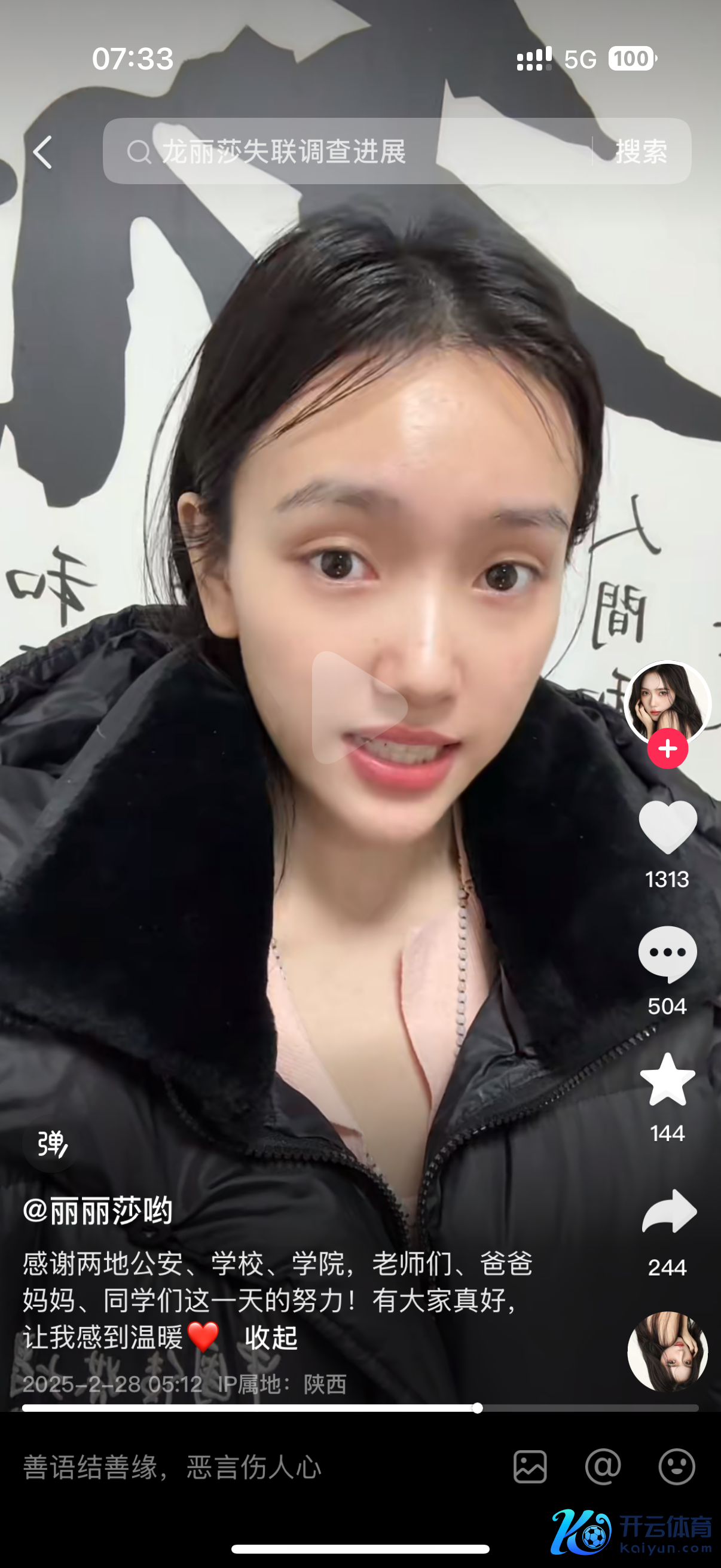 28日清晨5点摆布,龙某某抖音账号发布一条露脸视频,称“谢谢全球的随和和匡助,我照旧在警方的匡助下得手地和家东说念主汇合。但愿全球不信谣、不传谣开云kaiyun官方网站,我一切齐好,请全球不要顾虑。”